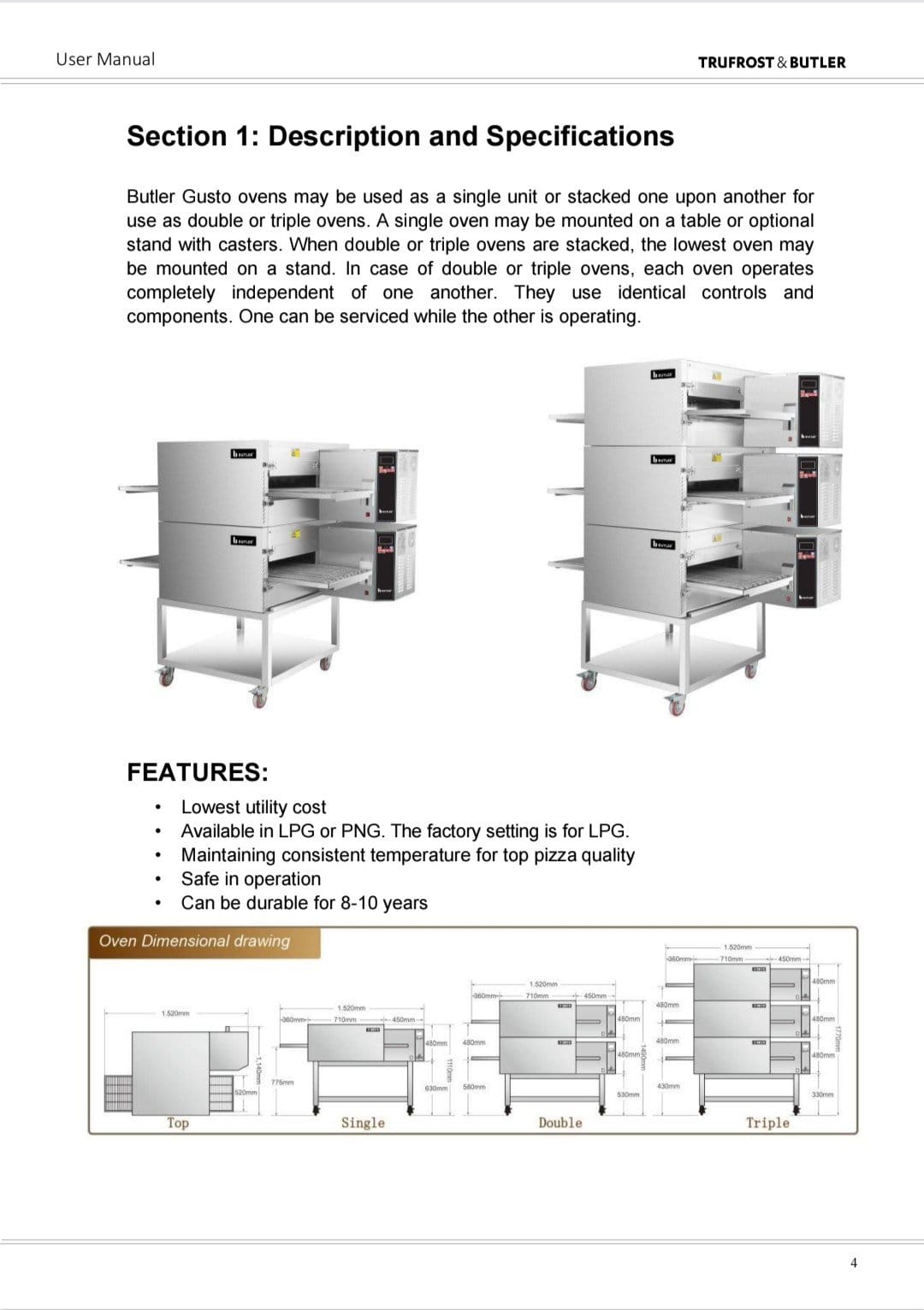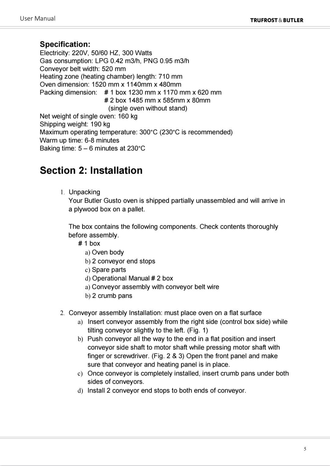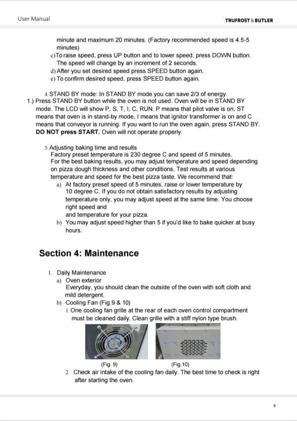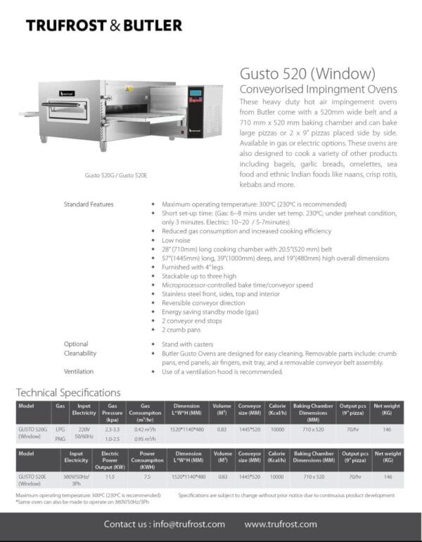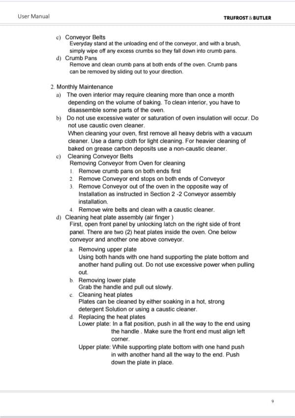 • Butler Gusto Ovens are designed for easy cleaning. Removable parts include: crumb pans, end panels, air fingers, exit tray, and a removable conveyor belt assembly.